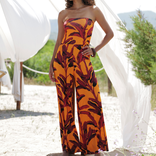 Fab new beach / resort wear jumpsuit in soft fabric may be worn as a bandeau over the bust or folded down and worn around waist