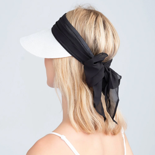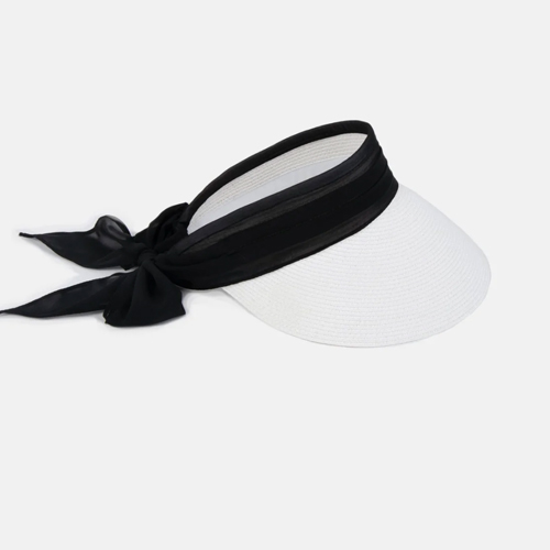 Beautiful sun visor in white with a black band and bow.
