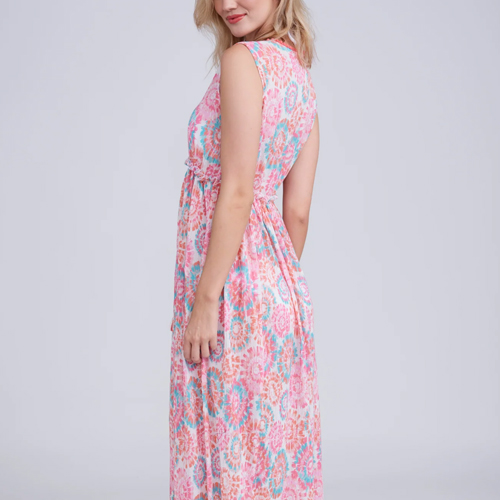 A pretty roman style longer dress in a soft cheesecloth printed fabric in pinks, corals & aquas