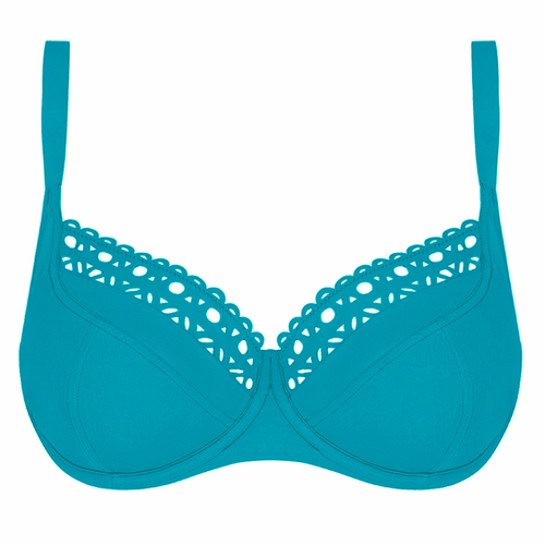 Stylish bikini top from Lise Charmel with laser cut pattern from the Ajourage range which may be worn halter necked or bandeau. This is the stunning new bright Lagoon turquoise.