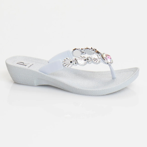 Add a touch of glamour and sparkle to your holiday wear with Pia Rossini wedges. These white wedged flipflops have diamante stones & silver shell detail along the footstrap and a smallwedge.
